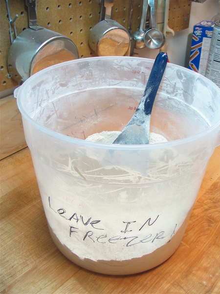 My hero gets dumped into a lidded plastic bucket and stored in the freezer. In a crowded test kitchen, as you can see, it's good to let people know what you want in no uncertain terms!