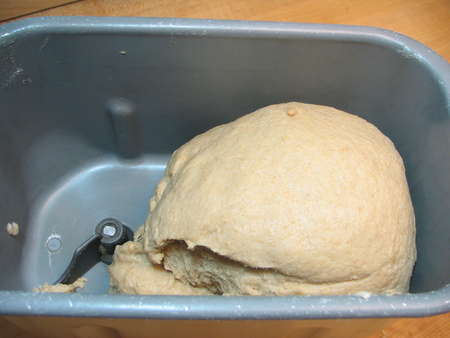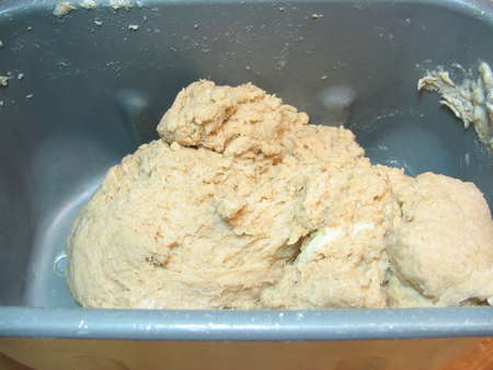 This is why I love our Zo bread machines. I can just put all the ingredients in the machine, press a button, and let ’er rip. This is what the dough looks like after a couple of minutes...