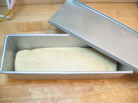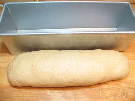 After it's risen, I gently stretch it into a 13” log, to fit my 13” pain de mie pan. I don't punch the dough down, or beat it up in any way. Dough is a living thing; I'm a non-violent person. It deflates most of the way as I squeeze it into shape, so punching isn't necessary and, as far as I can see, its necessity is an old wives’ tale, perhaps invented by an old wife who was REALLY tired of making bread every day.