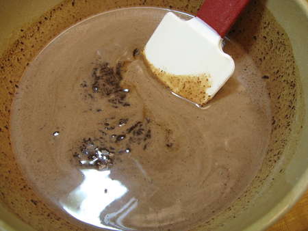 Pour the ganache into a parchment- or waxed paper-lined 9” x 13” pan. Don't spread it out; just let it sit there. Put the pan in the fridge for 60 to 90 minutes, till the chocolate is cold and “scoopable.”