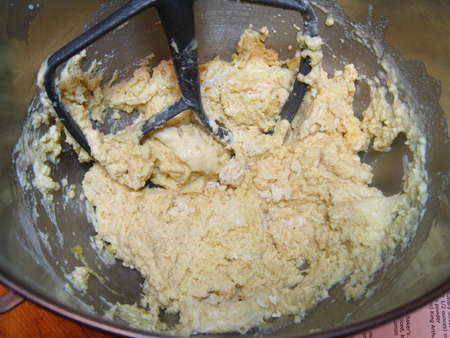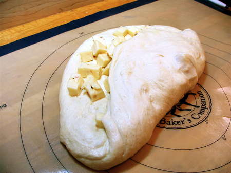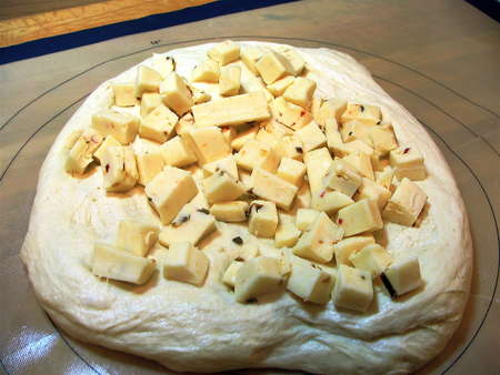 Flatten the dough slightly, and pile the cheese chunks on top.