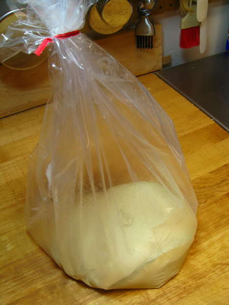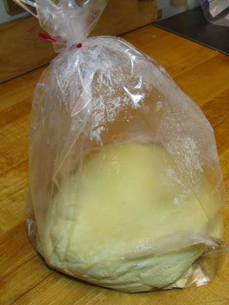 The dough goes in a big plastic bag, greased inside. An overnight rest in the fridge (or an up-to-36-hours rest) enhances both flavor and chewy texture. You can skip this step if you're in a hurry, but it actually makes the recipe more flexible; make the crust up to a day and a half ahead, then shape and top it when you're ready.