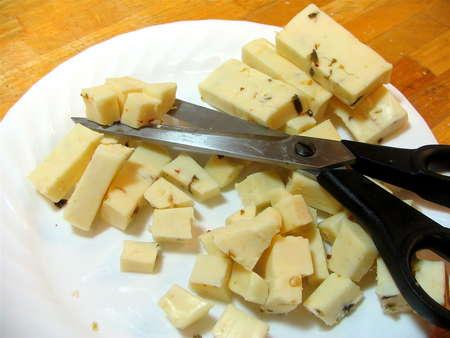Now comes the fun part: picking your favorite cheese to knead into the crust. This is Cabot's jalapeño cheddar. Or maybe it's chipotle cheddar; I enjoy them both. Anyway, you want to cut the cheese into small cubes. Once I make the initial slices, I find it's easier to put the knife down and cube cheese with a pair of scissors.