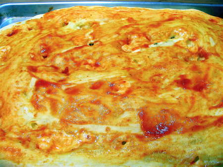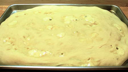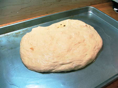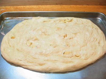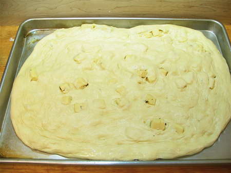 When you come back, 15 minutes later, you'll find you can probably push the dough all the way out to the edges of your half-sheet (18” x 13”) pan. The cheese chunks will begin to break through; that's OK. Cover the pan with greased plastic wrap, and let the dough rise while you're preparing the toppings.