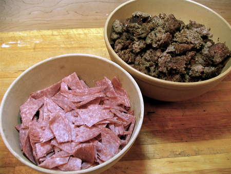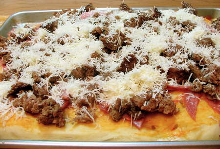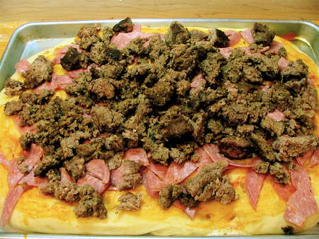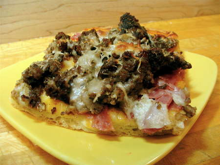Use whatever meat you like. Heck, use veggies if you want... this is an ecumenical pizza crust. I like to snip slices of Genoa salami into uneven shards, and fry up some pork breakfast sausage.