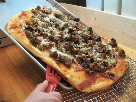 Bake the pizza for 15 minutes or so. When it's properly golden and melty and aromatic, take it out of the oven, and transfer it to a rack. If you leave it in the pan, the bottom will steam and get soggy.
