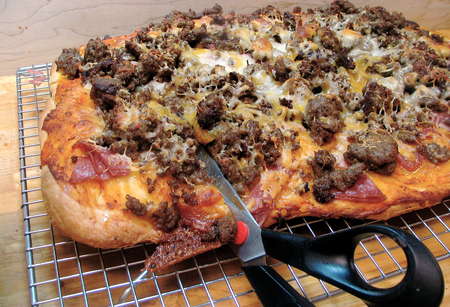 But back to the pizza. King Arthur’s recently departed marketing manager, Matt Marrazzo, was always my culinary partner in crime. We taste-tested different flavors of Kettle Brand potato chips regularly; Spicy Thai was our favorite. We compared recipes for eggplant Parmesan, for sausage and meatballs. And Matt loves pizza just as much as I do. In fact, this pizza was born when I asked him what kind I could make for his birthday, and he described a pie heavy on the meat, thick and cheesy. I made it, incorporated my own twist (cheese inside the crust), and it’s since been dubbed Matt’s Meat Lovers’ Pizza.