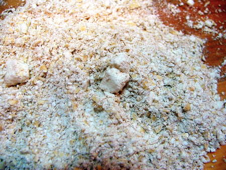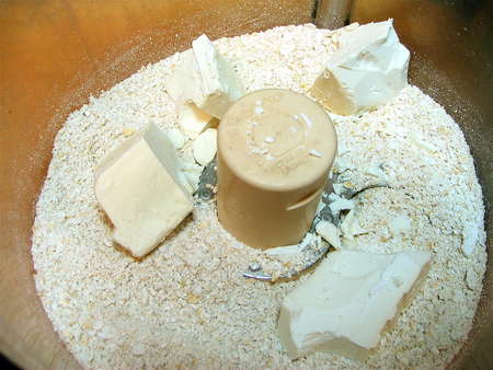 Next, we grind some oatmeal in a food processor (I've use a mini processor here), till it's pretty finely ground. Then add white chocolate chunks or chips, and grind again, just till the large chunks have disappeared.