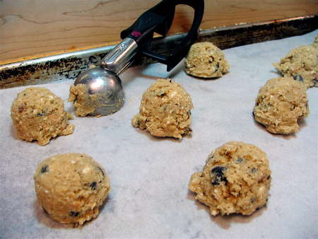 Once you've added the chips, scoop the dough onto parchment-lined or greased baking sheets. A tablespoon cookie scoop works well for this task. Be sure to leave 2” between the dough balls.