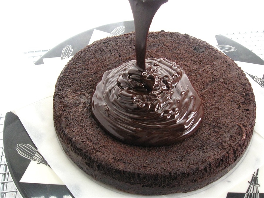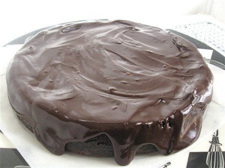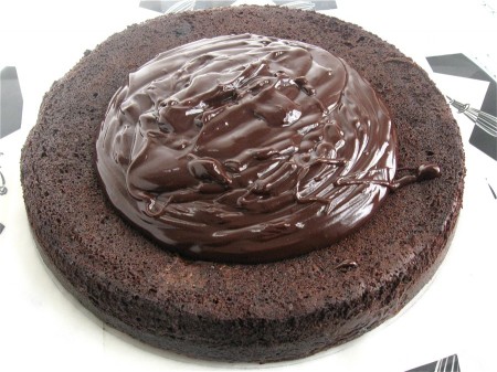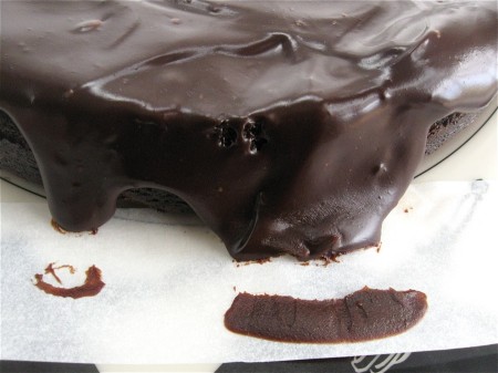 Spread the ganache to the edges of the cake, encouraging it to drip down the sides. It doesn't need much encouragement once you push it to the edge.