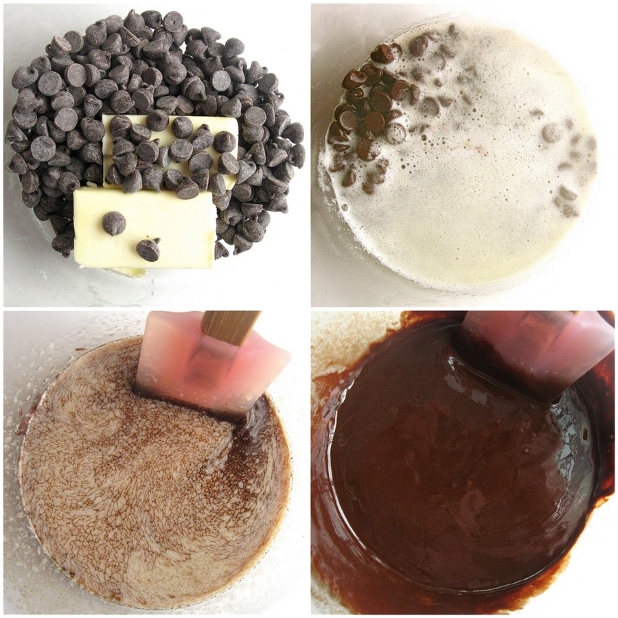Put 1 cup (170g) semisweet or bittersweet chocolate chips and 8 tablespoons (113g) unsalted butter in a microwave-safe bowl, and heat until the butter is melted and the chips are soft. Stir until the chips melt, reheating briefly if necessary. You can also do this over a burner set at very low heat. Transfer the melted chocolate/butter to a mixing bowl.