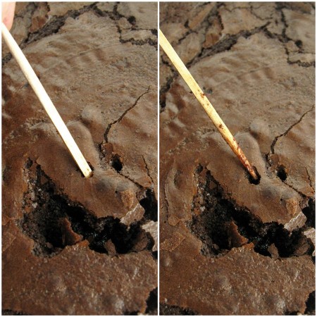 A toothpick inserted into the center of the cake should come out with moist crumbs clinging to it; again, this is slightly over-baked, as evidenced by the paucity of crumbs.