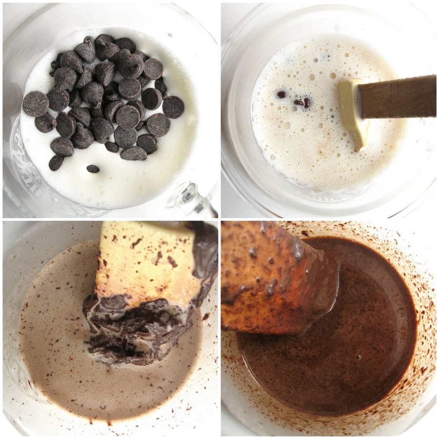 To make the icing/ganache, heat 1 cup (170g) semisweet or bittersweet chocolate chips and 1/2 cup (113g) heavy cream together until the cream is steaming. Remove from the heat, and stir until the mixture comes together.