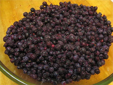 First step: frozen blueberries. Dump them into a microwave-safe bowl. If you want to make this recipe with fresh berries, try our recipe for Summer Fruit Crisp, substituting blueberries for the peaches.