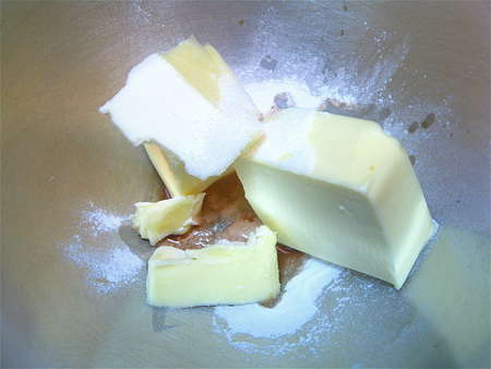 Start with butter, salt, vanilla, and baking powder. No sugar? Not yet.