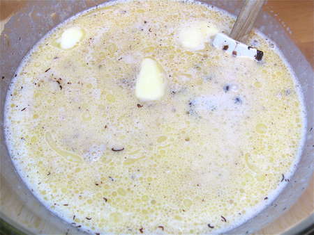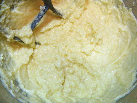 Add eggs, and it looks like... well, scrambled eggs. That's OK; the curdled effect will disappear when you add the flour.