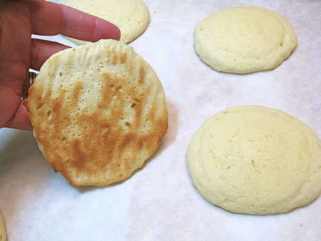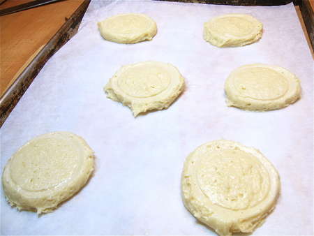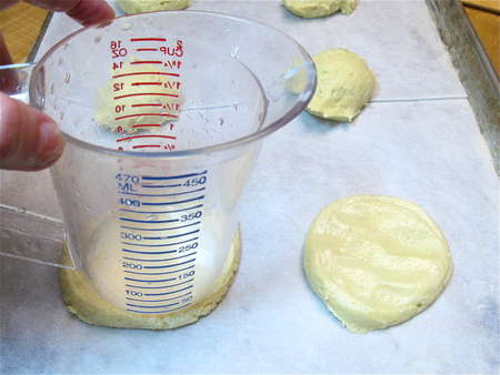 Flatten each mound of batter into a 3” round. I use a measuring cup with a 3” base. Dip it in water, and press down gently; works just fine. You can also use your fingers (dipped in water), or whatever method you prefer.