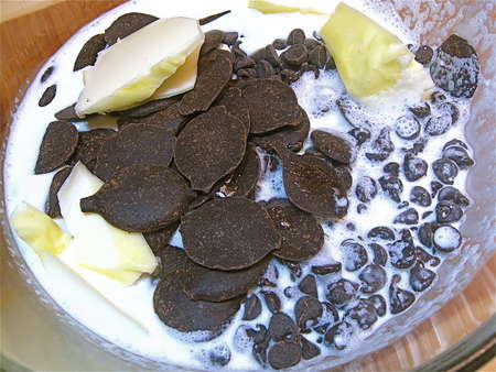 This is one of my favorite icings: chocolate ganache, a mixture of chocolate and heavy cream. This one is enriched with butter and some corn syrup, and uses both semisweet and unsweetened chocolate. Put everything in a microwave-safe bowl.