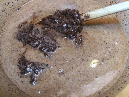 Then start to stir. At first you'll think, no way. What a mess! Oh no, I just wasted all that chocolate! Calm down... keep stirring...