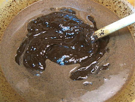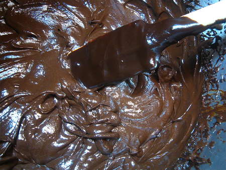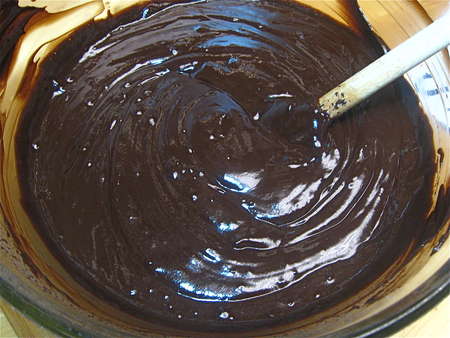 Continue to stir till it's totally combined and smooth. And there you have it: chocolate ganache! But we're not done yet. First, let the icing cool to room temperature; this will probably take several hours. Yes, you can speed the process by refrigerating; just be sure to stir frequently, so the icing doesn't get too thick around the edges while it's still warm at the center.