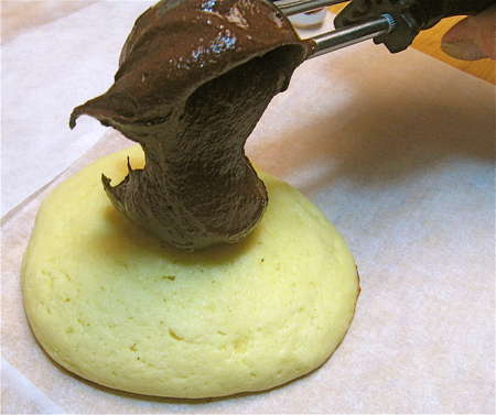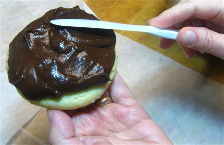 Spread the icing atop the cookie, leaving a border around the edge bare. This bare border accomplishes two things. First, it makes it easier to pick up, handle, and store the cookies. And second, it serves to heap the icing even higher in the center, which makes for a very impressive presentation.