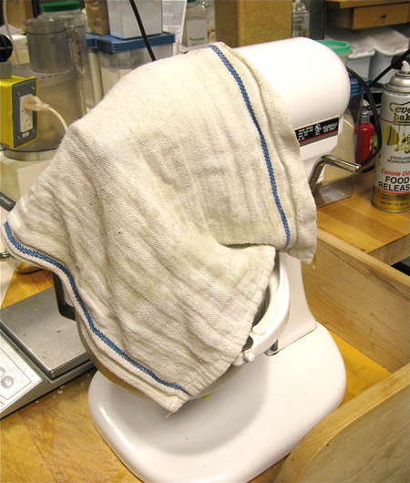 First, beat eggs, milk, and vanilla at high speed for 3 minutes. To me, that means splatters everywhere... thus the dish towel draped over the mixer bowl. I know, I know, a splatter guard came with this KitchenAid, but who knows where it is? Not I.