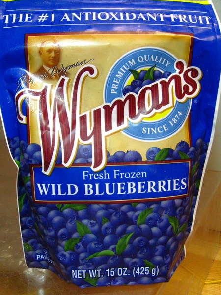 Next, get out your blueberries, either fresh or frozen. I like these Wyman wild blueberries; excellent quality, at an excellent price. They're gradually going national; if you don't see them at your preferred supermarket, ask the manager if (s)he can get them.