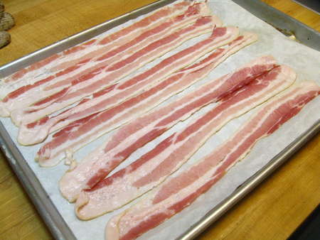 Next, the bacon. When you don't feel like standing over a grease-sputtering frying pan, lay the strips on a parchment-lined baking sheet, and bake them instead.