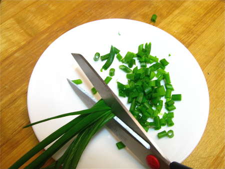 Snip the chives or scallions. I use my handy scissors (not kitchen shears; regular scissors) for everything from chunking tomatoes to snipping scallions to slicing pizza to cutting chicken preparatory to stir-frying.