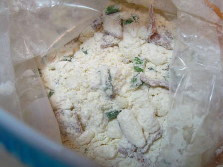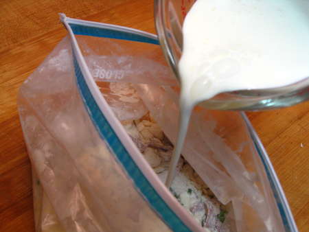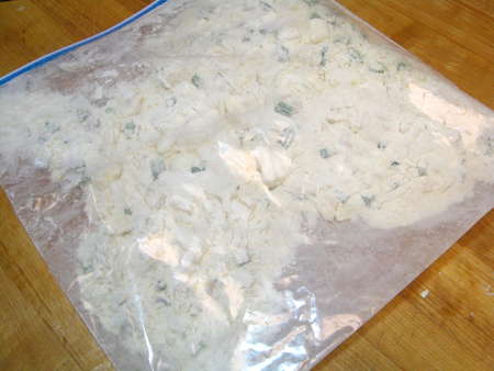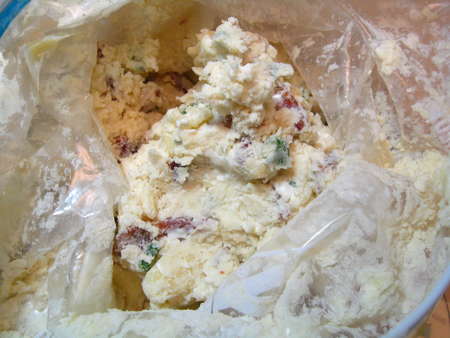 I had this theory that it might be easy to put together scone dough in a gallon-size zip-top freezer bag. So I put the dry ingredients, plus cheese, chives, and bacon, into the bag.