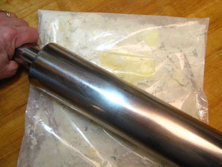I rolled it all a few times, to flatten/smear the butter cubes and work them into the flour. This method of working butter into flour to make pastry actually has a name: “frissage,” pronounced free-SAHJ. Go ahead, impress your friends with this knowledge next time you're talking about scones or piecrust.