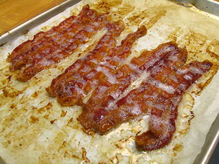 When the bacon is nicely browned, take it out of the oven.