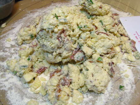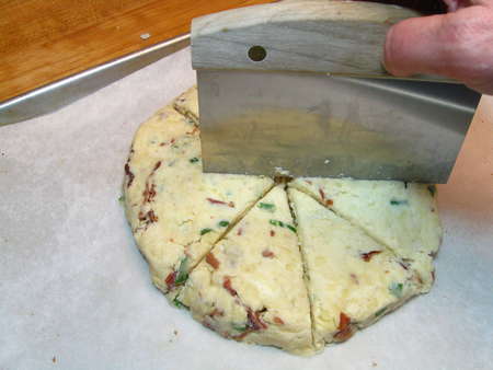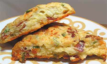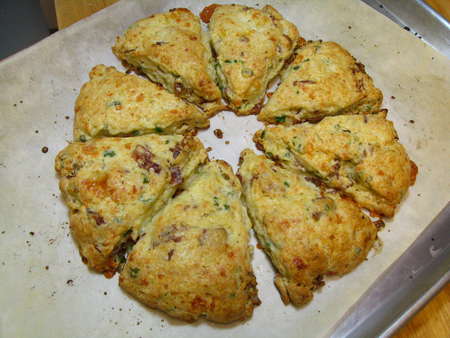 I explored ABC's Web site, hoping to find a picture of these wondrous, soon-to-be-imitated scones. No luck, though I did find a short description: “Bacon Cheddar Scallion Scones—Our cream scones with a savory twist.” Ah-HA! Clue #1. They’re made with cream. I also found a picture of their fruit scones, which were made in the traditional wedge shape. So that was Clue #2. But beyond that—well, it was time for my imagination to take over.