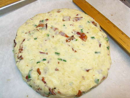 Into a 425°F oven, and 25 minutes later, golden, bacony-cheesy scones.