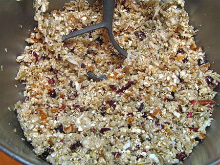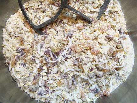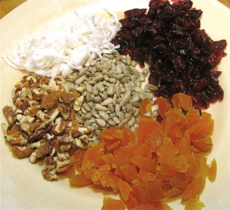I like to gather my “add-ins” first. Today, I've chosen diced apricots, dried cranberries, sunflower seeds, walnuts, and coconut. You'll need 2 to 3 cups of your favorite dried fruits and nuts and seeds.