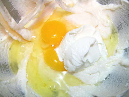 Then stir in the sour cream (or yogurt), and flour, alternating one with the other to keep the batter light and lump-free.