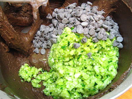Now add chocolate chips, and 3 cups of shredded or grated (not liquefied!) zucchini. Which translates to about 1 medium (10”) zucchini, about 12 3/4 to 15 3/4 ounces. I know, this doesn't make much of a dent in your crop. But wait—there's more! Let's get through the cake first.