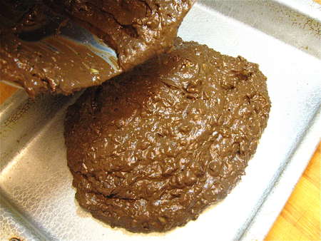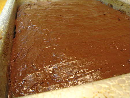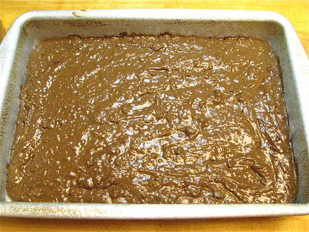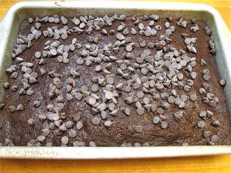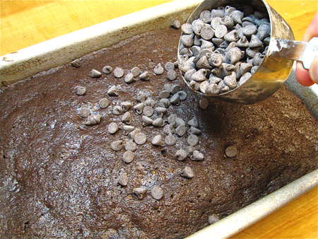 Bake the cake till the top springs back and it seems fairly set, about 30 minutes. Then remove it from the oven, and sprinkle the top with 1 cup of chocolate chips.