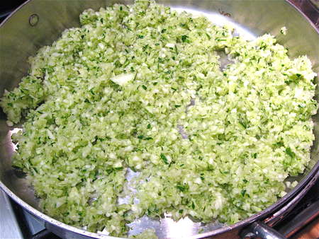 There's no written recipe for this, so don't be looking for it online. What you see here is as formal as it gets. First, heat some olive oil in a big pan. Then add grated zucchini. You can add enough to cover the bottom of the pan to a thickness of about 1/2”, but don't heap it up too much; it needs to sauté.