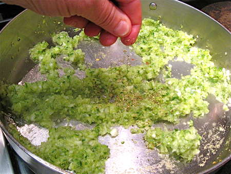 Fry the zucchini till it shrinks and its liquid evaporates, then sprinkle in salt to taste, ground black pepper, and Italian seasoning or your favorite combination of oregano, basil, hot pepper... whatever herbs you like.