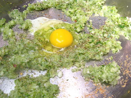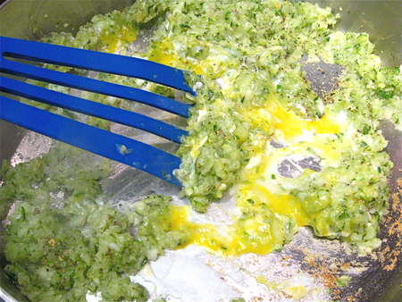 Now add an egg or two or three. For this 12” skillet's worth of zucchini, I added 2 eggs.