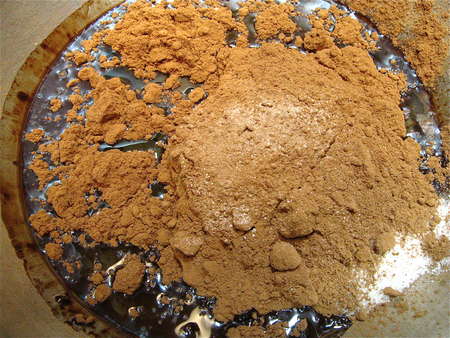 In a separate bowl, combine sugar, oil, vanilla, salt, baking soda, cocoa, and espresso powder.