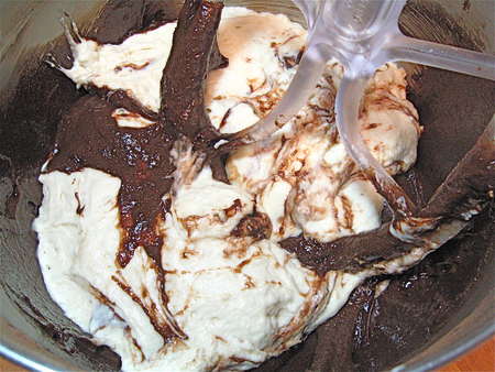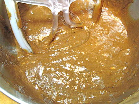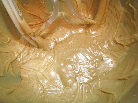 It's kind of gloppy at first, but just keep beating slowly till it's smooth. Notice how it lightens in color, too.