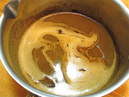Melt butter in a saucepan, then add buttermilk or yogurt + espresso powder dissolved in hot water. Heat just to a boil.
