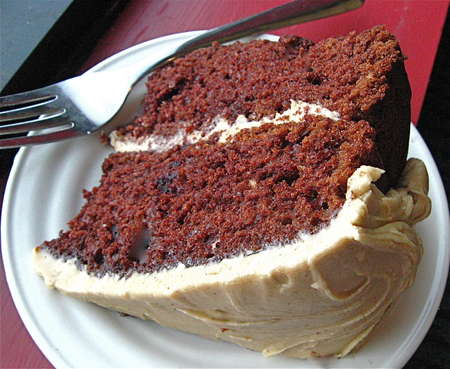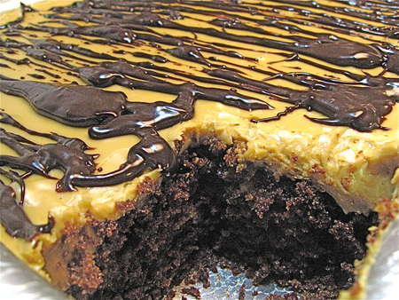 Notice the thick layer of icing. The first time I made the cake, the icing was pretty scanty, so I increased the recipe by 50%.