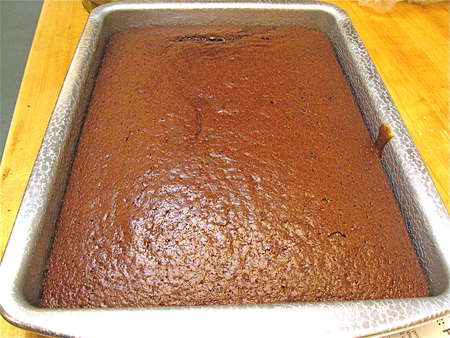 Bake for 30 to 40 minutes, till the edges are starting to pull away from the sides of the pan; the top springs back when pressed lightly; and a cake tester inserted into the center of the cake comes out clean. Let the cake cool a bit while you prepare the icing.