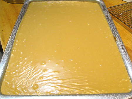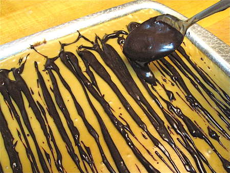 Pour the icing over the cake in the pan. (Hopefully you've used a deep enough pan that you can do this... Mine is nearly 2 1/4” deep.) Those aren't lumps— they're bubbles! The icing solidifies quickly, so don't be answering the phone or letting the cat out while you're in mid-process here.