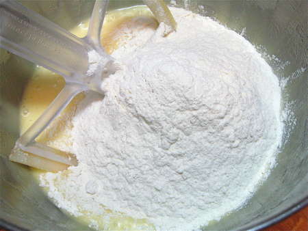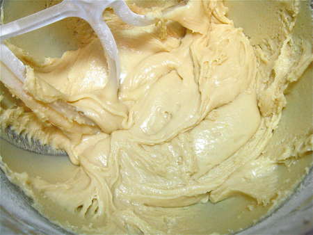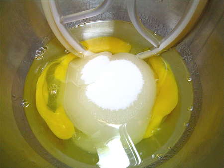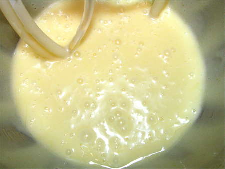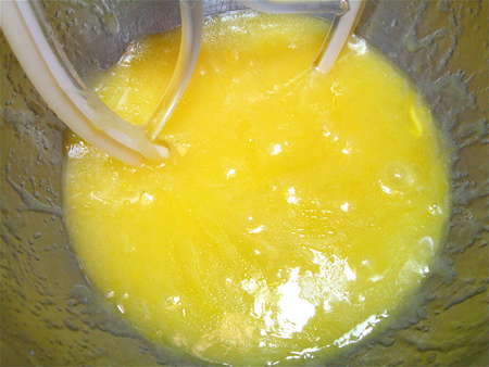 Then continue beating for about 5 minutes, till the mixture is lighter in texture and lemon-colored.