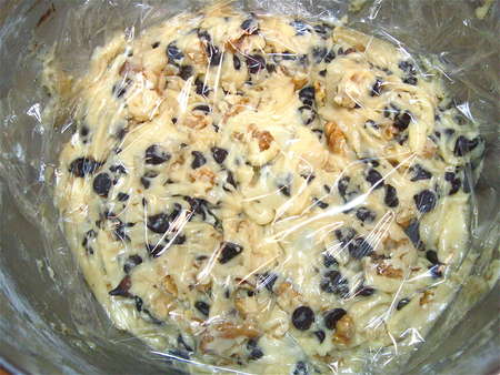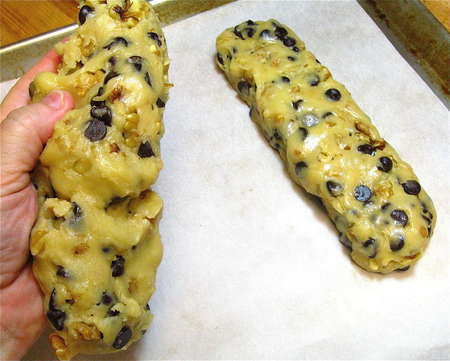 Since tomorrow is Rosh Hashanah, let’s get on the stick here and make mandelbrot—chocolate chip and walnut version. For the traditional version, substitute almonds for both the chips and walnuts.