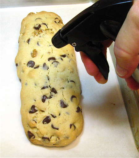 Remove from the oven, and spritz lightly with water; this will soften the logs’ crust just a bit, making them easier to slice. Let the logs cool for 10 minutes before slicing.